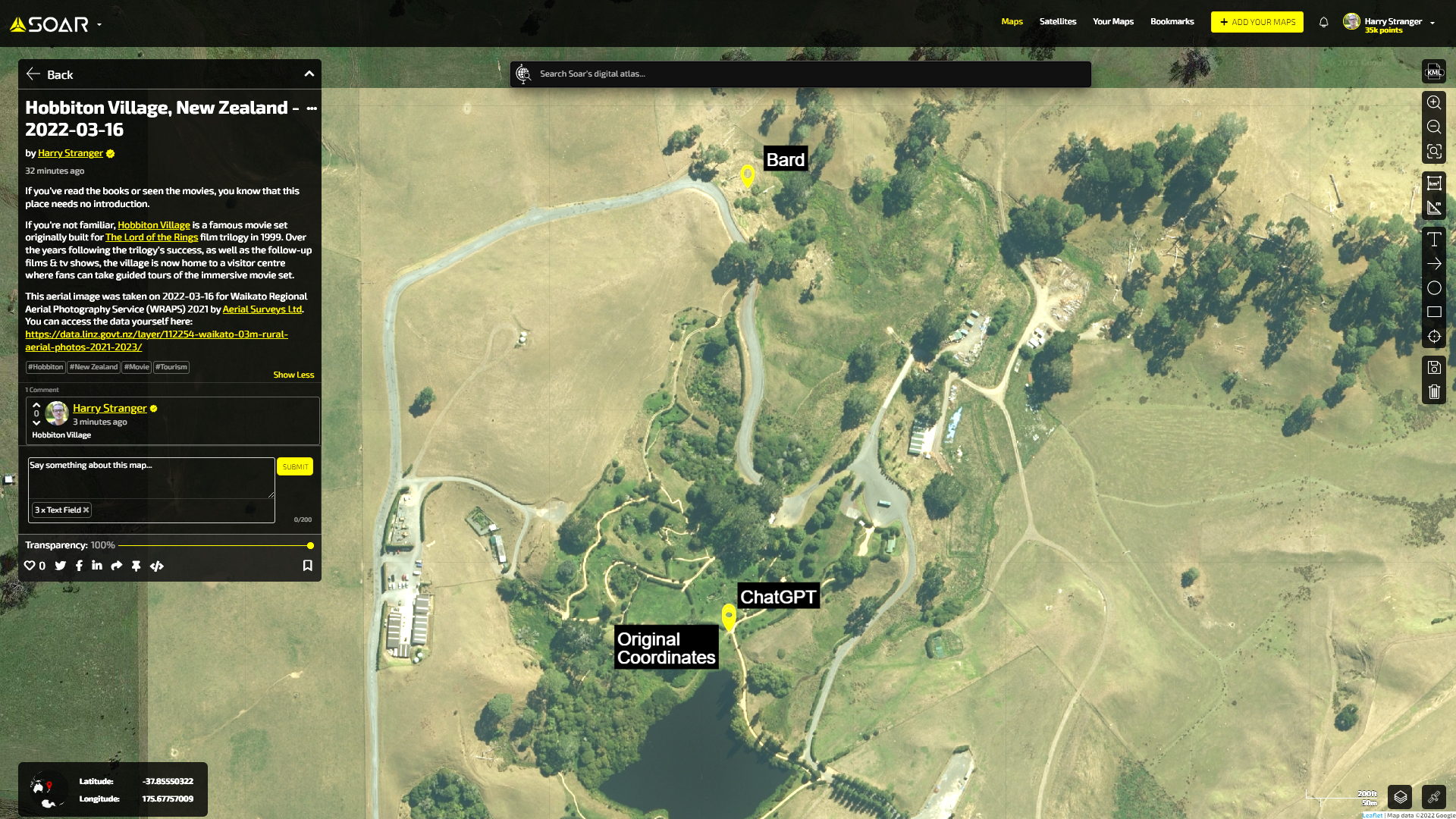 Comparing the converted coordinates on Soar reveals the alignment between ChatGPT's results and the original coordinates, highlighting the potential of AI mapping assistants.