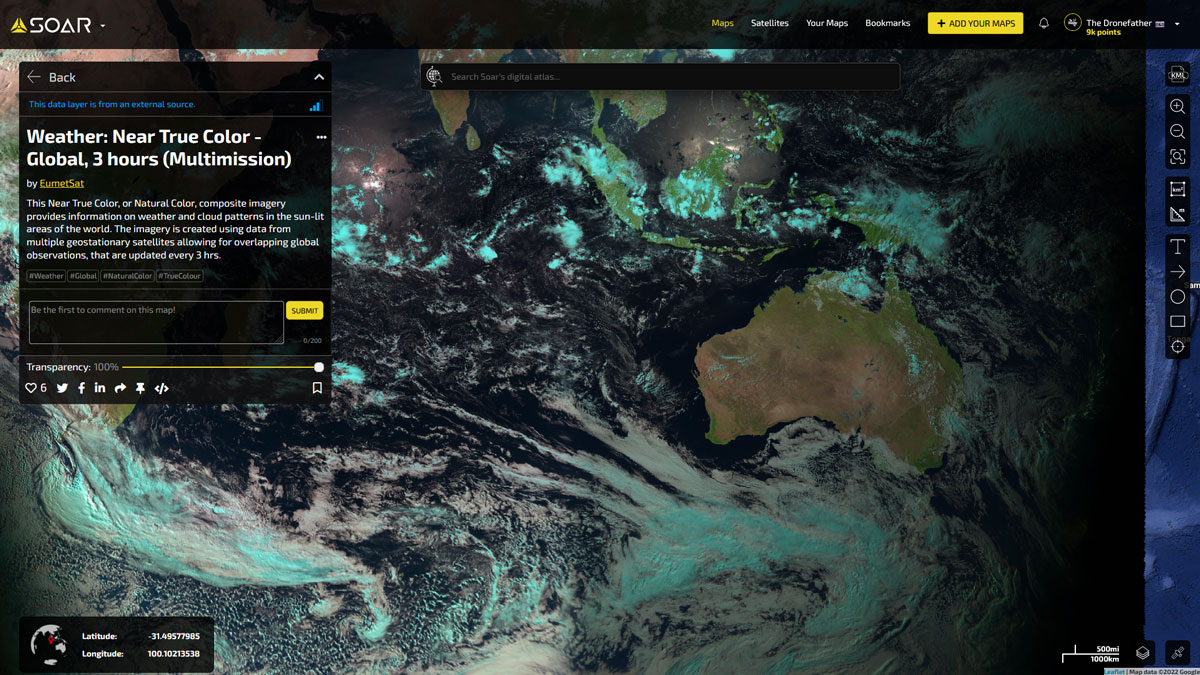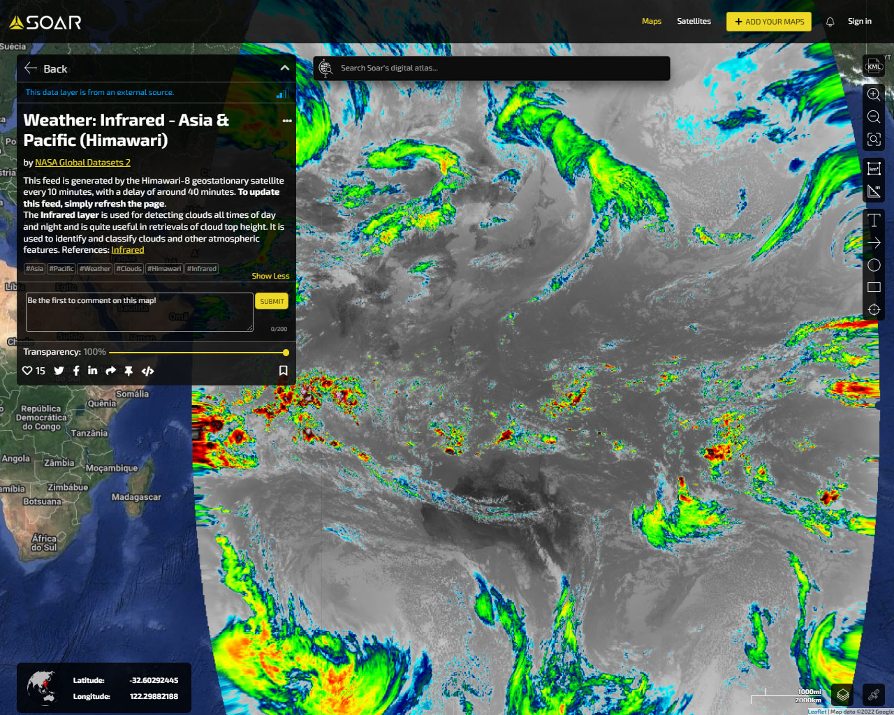 Himawari-8 is a meteorological satellite that covers the area of Japan and parts of Asia and Oceania, including Australia. The satellite is stationed over a determined area of the globe, for which they are called Geostationary Satellites. Geostationary Satellites stay in very high altitude orbits, around 36,000 km, to keep their position always over the same point of the globe.