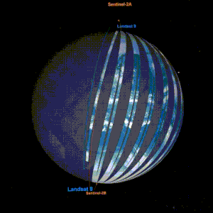 There are other types of Earth Observation (EO) satellites that follow different orbits around the globe, like the Landsat and Sentinel series. These satellites can take pictures of the whole world all around, instead of staying stationed over the same point. They are put in orbits passing near the poles at lower altitudes around 800 km, while the Earth turns round, so that each day they can advance to another location and take pictures at near the same Sun-light time. These satellites are called Polar Sun-Synchronous Orbit Satellites.