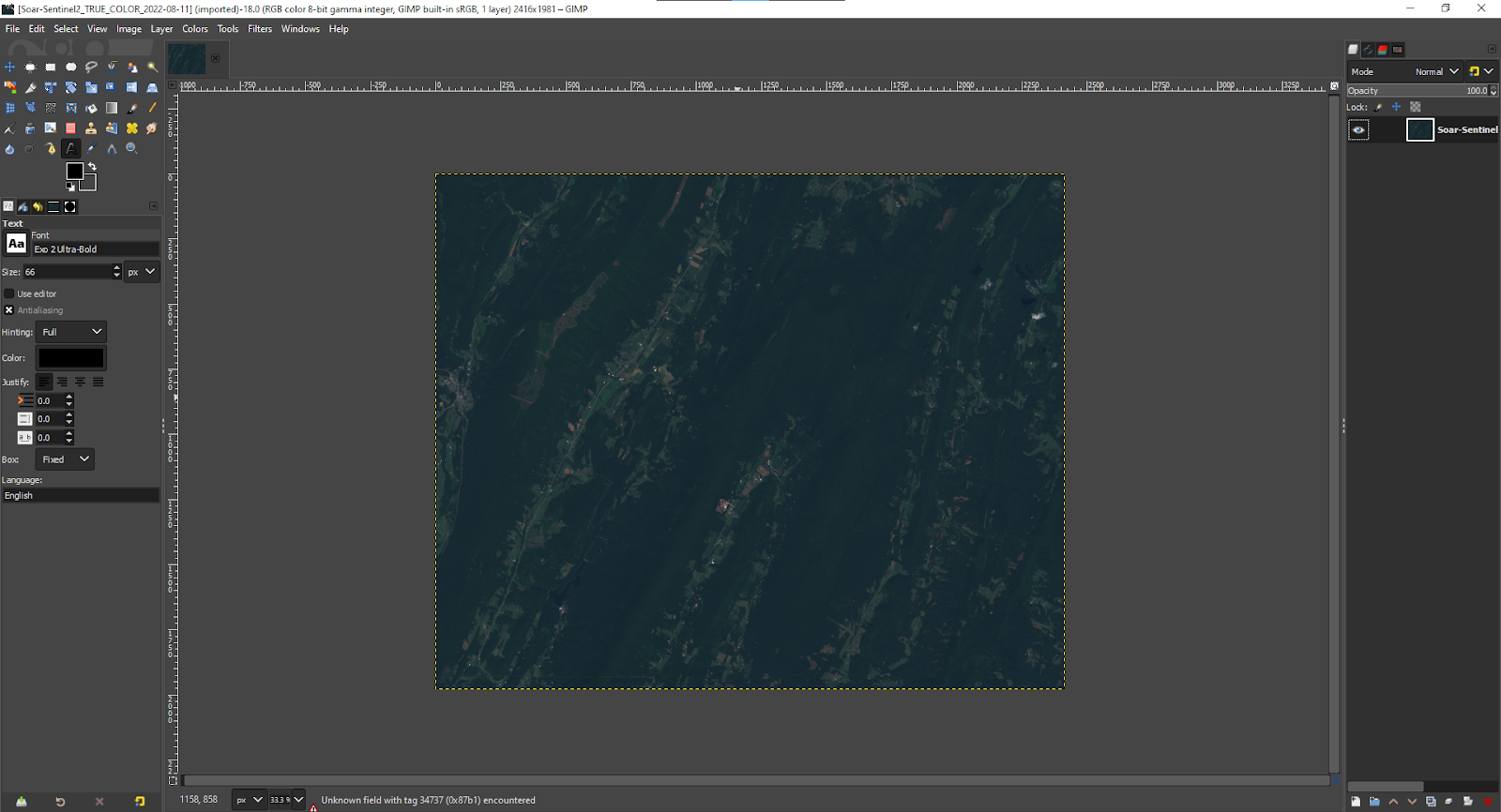 download GIMP 2.10.32 here (It’s free!). Don’t forget to also download your imagery from Soar. Next, drag your imagery into GIMP. It should look something like this.
