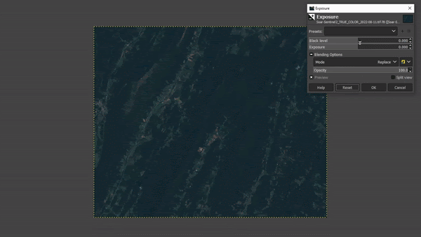 To do this, go to Colors>Exposure. Increase the black level and exposure until you’re happy with the results. You’ll usually want to set these roughly to what I have in the gif below. For most imagery, the black level will be higher than the exposure.