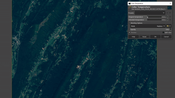 Next, adjust the temperature of the image by going to Colors>Color Temperature. Changing these values will help you get the blues out, and bring the warmer colors in. For imagery like ours that has a lot of green in the image - this is a very powerful and easy tool.