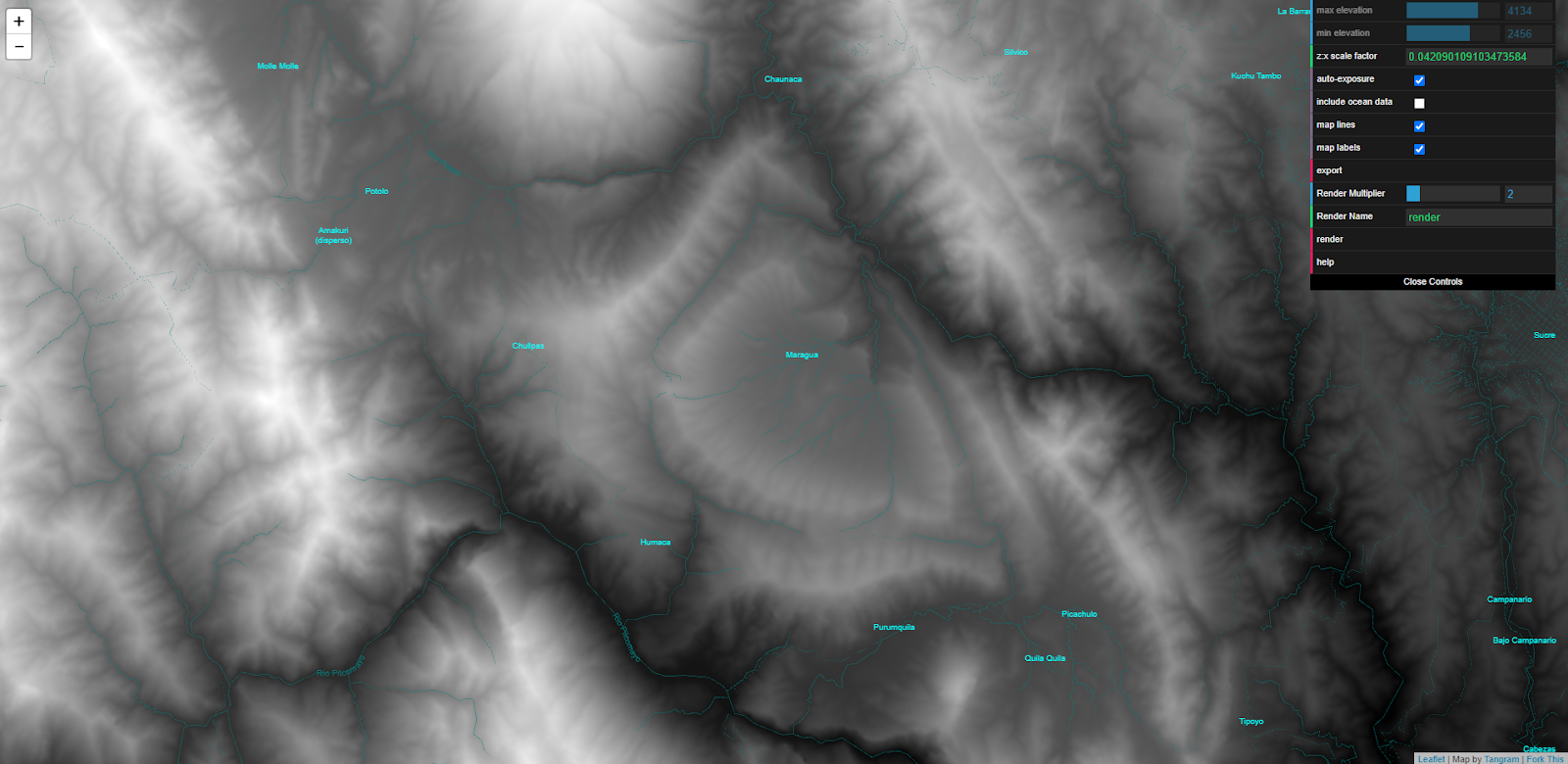 After some digging, I found the same location as the map on Soar in Tangram. You can play around with the values until you get something that isn’t blown out or dark. When I was happy with the map, I could render out the area as a png. I then overlaid both the ‘texture’ (aka the original map) and the height-map as best I could to line them up so they match.