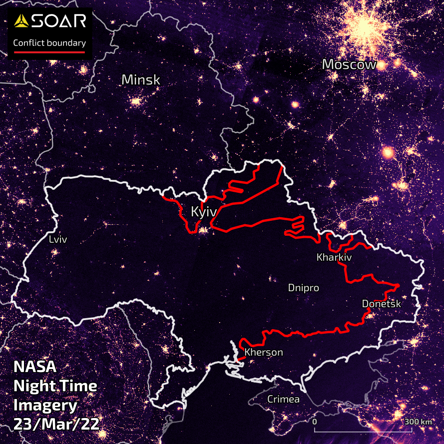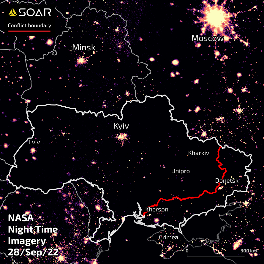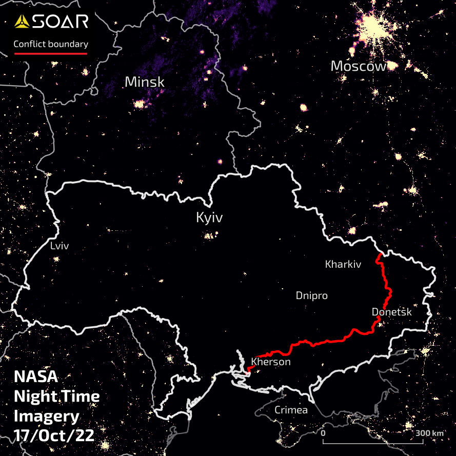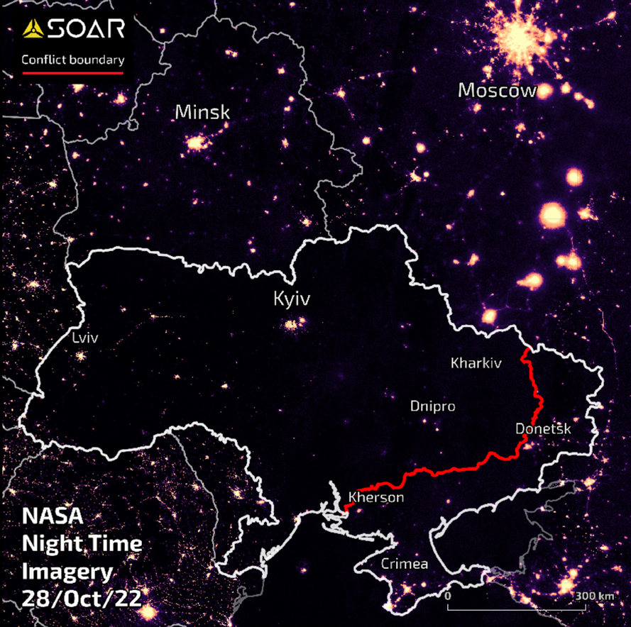 This report contains a summary of qualitative research conducted by Soar using publicly available data from the NASA night time satellite sensors over Ukraine. The collection of imagery processed by Soar compares imagery from before the Russian invasion through to the month of October, 2022.