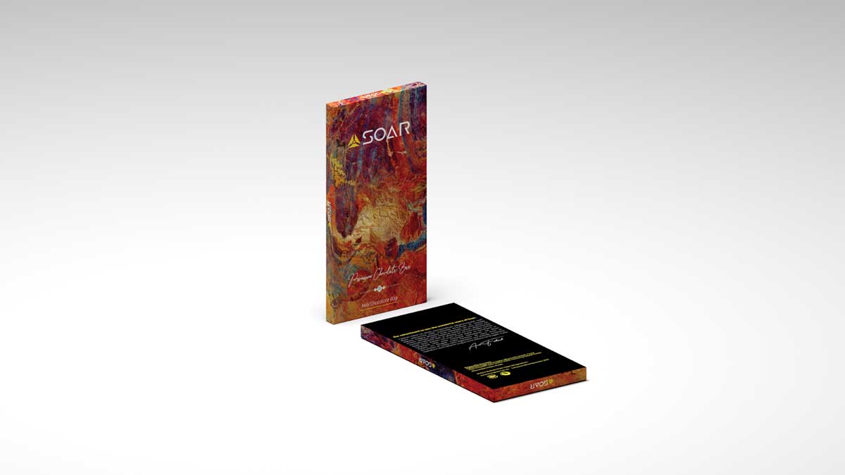 When it came to planning and designing our first custom item, we wanted to do something fun. Nothing’s more fun than chocolate, so we made our very own custom Soar premium chocolate bar. This was no easy task and took many design attempts to get just right.