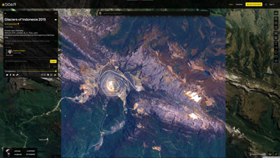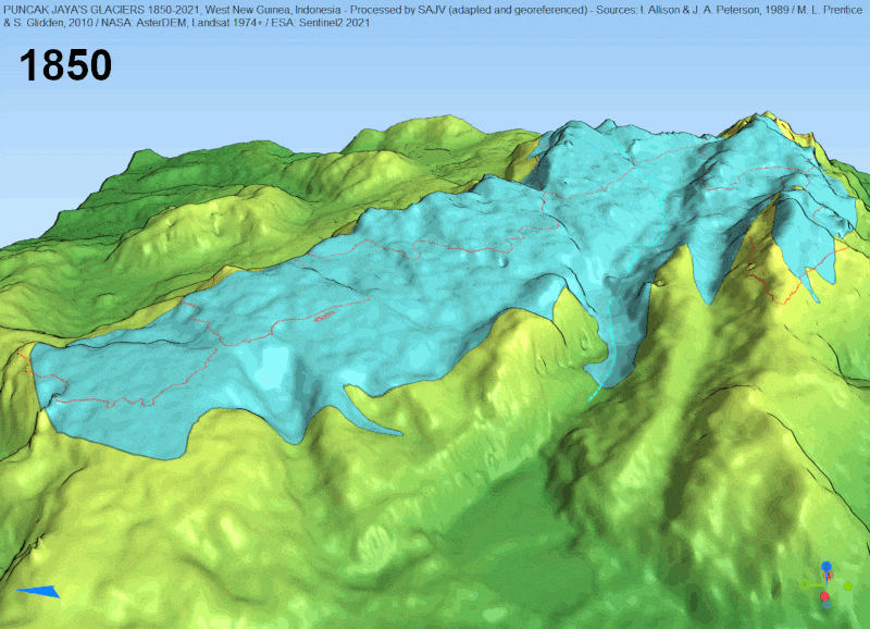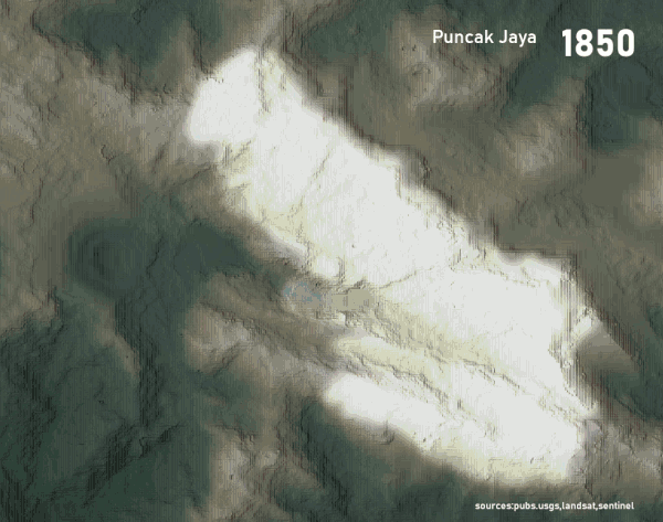 Animated sequence of snow area receding on Puncak Jaya’s glaciers using various data sources ranging from implied cartographic surveys, aerial imagery through to satellite imagery. Note the construction of the Grasberg copper mine in 1972 to the west of the image.