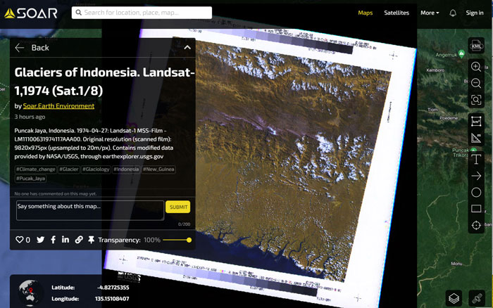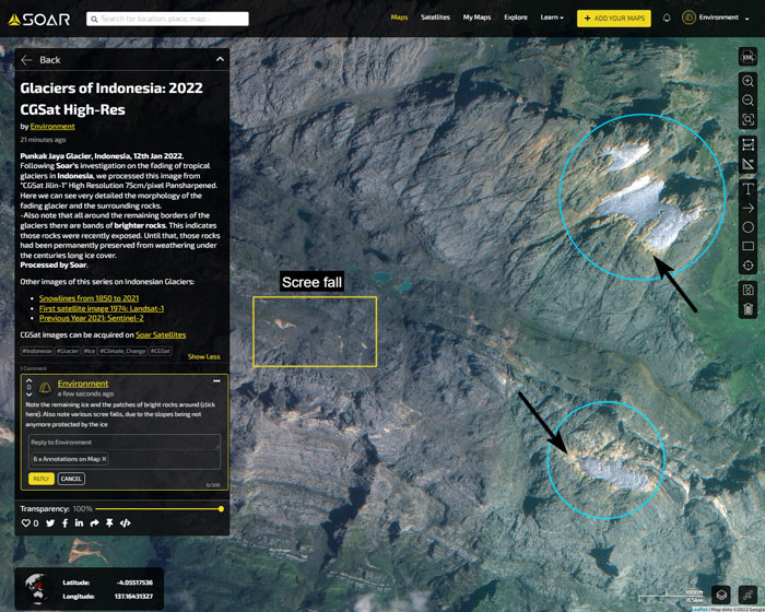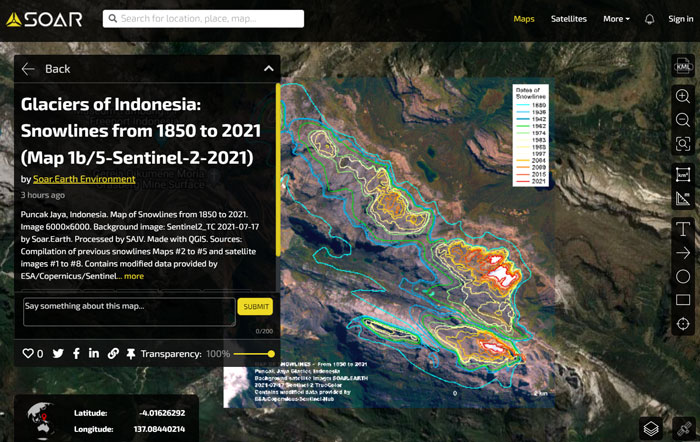 A series of satellite images were also uploaded to Soar, supporting the hypothesis that the snowlines are retreating, as well as confirming the disappearance of previously snow-covered areas, which were not glaciers, but equally important due to the microclimate support they gave. The full list of maps with their links to Soar are below: