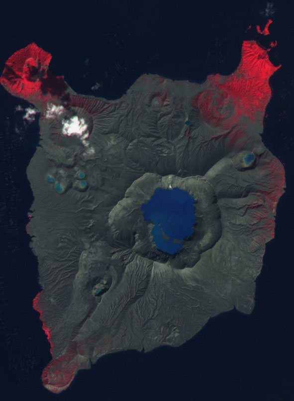 The eruption vapourised the lake at the centre of the volcano and left the tree-covered island buried under a blanket of ash, as seen from satellite imagery taken before and after the eruption.